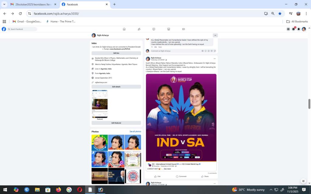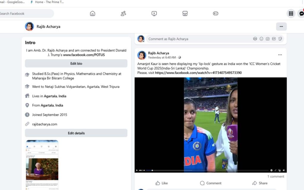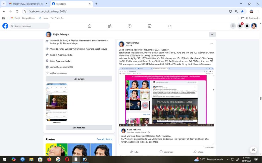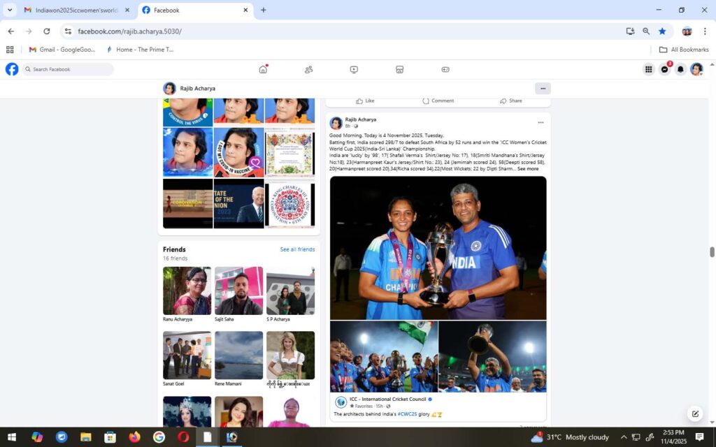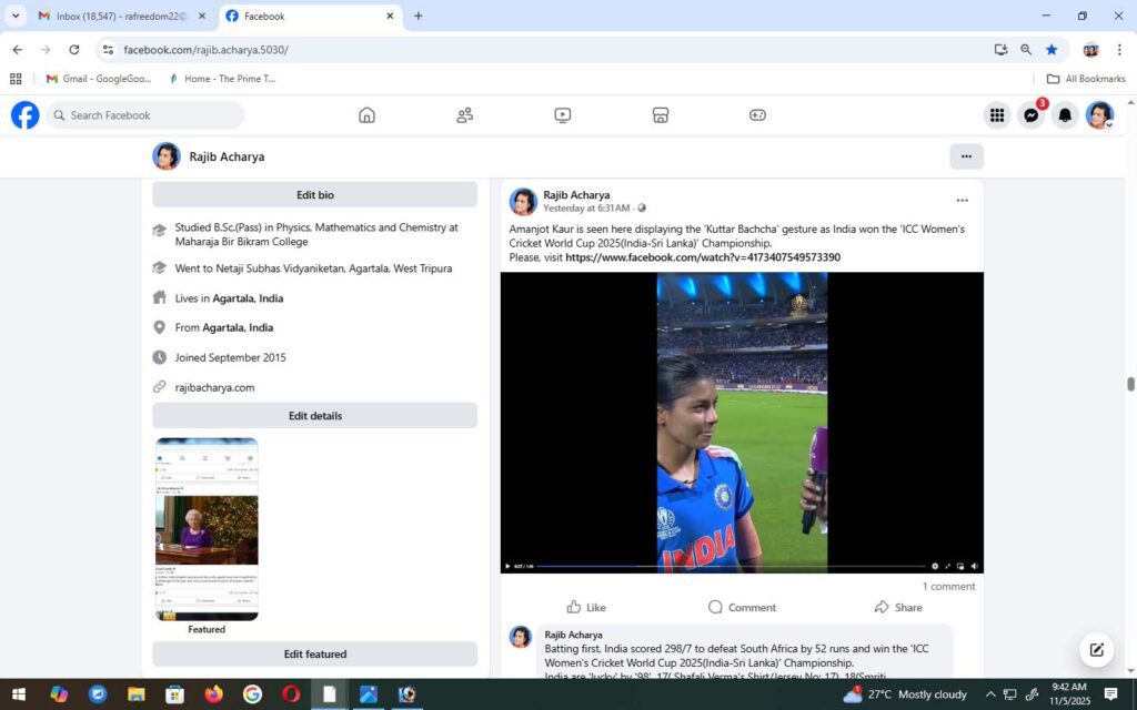 Amanjot Kaur is seen here displaying my ‘lip-lock’ gesture as India won the ‘ICC Women’s Cricket World Cup 2025(India-Sri Lanka)’ Championship. Please, visit https://www.facebook.com/watch?v=4173407549573390 Rajib Acharya Batting first, India scored 298/7 to defeat South Africa by 52 runs and win the ‘ICC Women’s Cricket World Cup 2025(India-Sri Lanka)’ Championship. India are ‘lucky’ by ’98’, 17( Shafali …